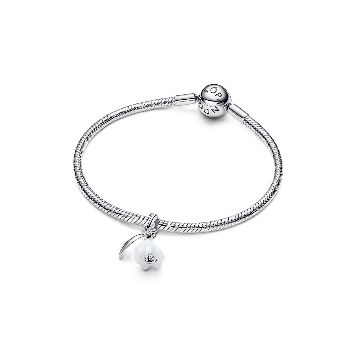 Pandora Vedhæng 794239C01 indfanger vintergækkens stille styrke i sterling sølv. Det hvide Murano-glas og de funklende zirkoner skaber et let, feminint udtryk, der løfter ethvert Pandora Moments-armbånd eller -kæde. Et smykke med mening, skabt til kvinder, der bærer elegance med mod og personlighed.